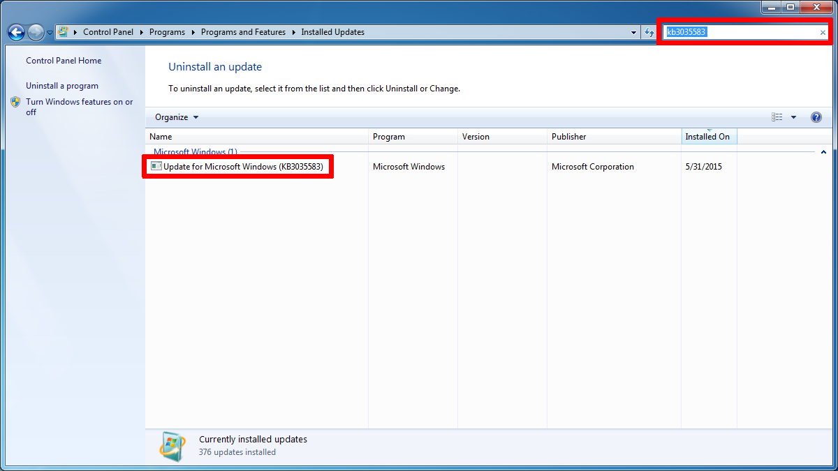 - Recherchez la mise à jour « KB3035583« , faites un clic-droit dessus et sélectionnez « Désinstaller » (voir capture d’écran ci-dessous)