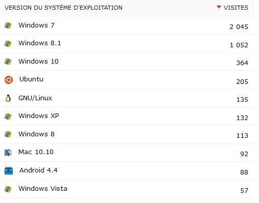Les systèmes d’exploitation les plus courants sont Windows 7 (43,4%), Windows 8.1 (22,3%) et Windows 10 (7,7%… vous lisez vraiment le contenu de ce blog avec cet OS ?). Mes copains linuxiens tombent juste derrière avec un peu moins de 8% de distributions diverses et variées. Merci les amis manchots de venir me visiter !
