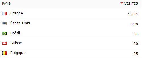 La majeure partie des lecteurs provient de France (89,9%), mais nous avons la joie d’accueillir 6,3% d’américains (coucou les bots !), 0,6% de suisses (coucou les compatriotes !) et même 0,5% de belges (merci pour les excellentes bières, en passant !).